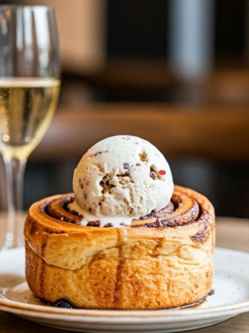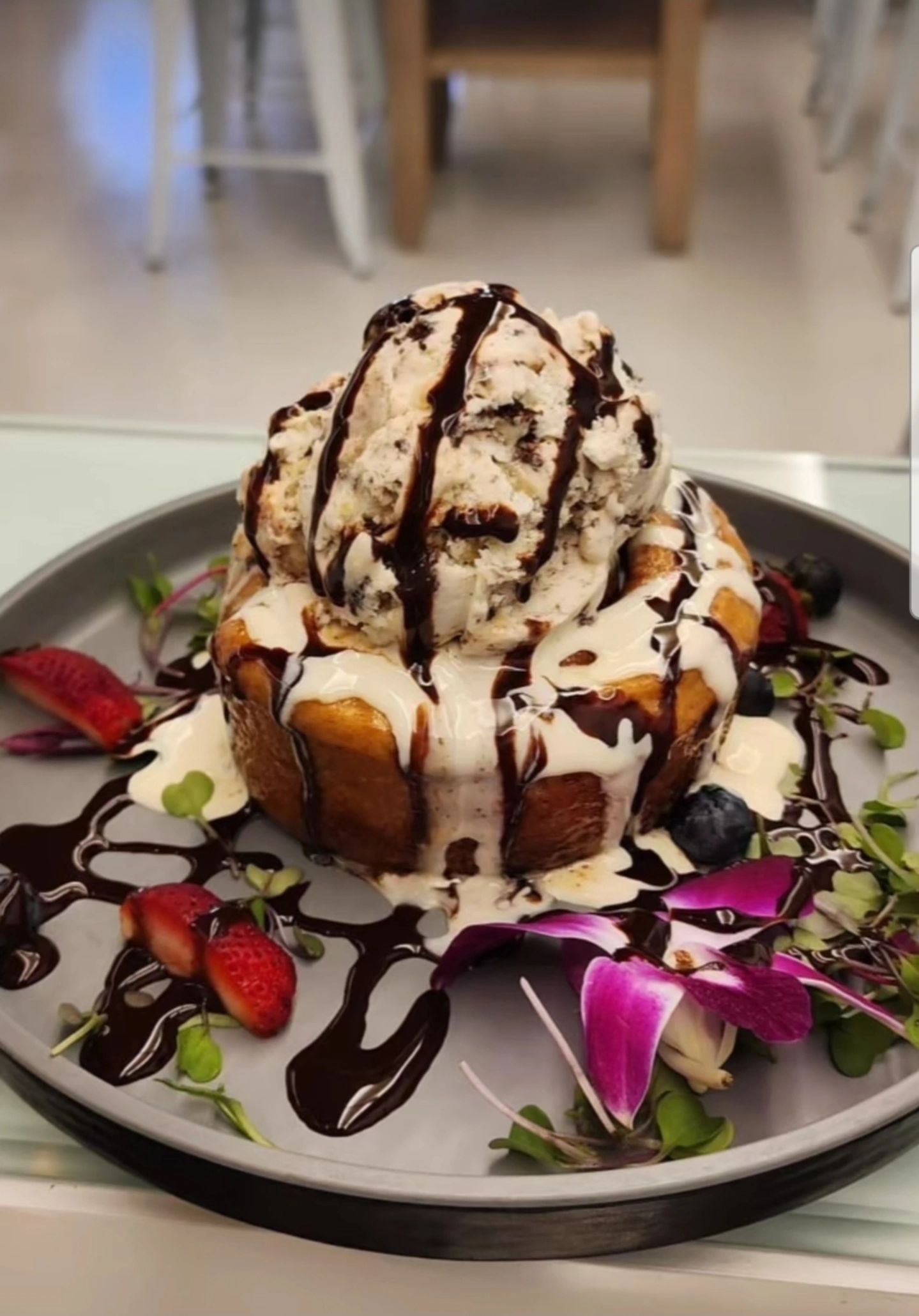 warm gooey cinnamon roll with a scoop of your favorite ice cream